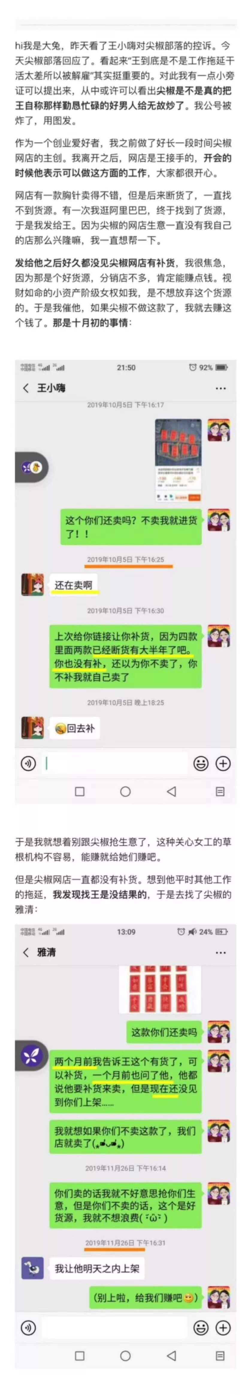 在我发出关于尖椒部落非法解雇我一事的两篇文章后,大兔和雅清,还有其她一些所谓的女权人士,在朋友圈和公众号上,发布了一系列回应。这些回应,没有答复我所质疑的任何问题,反而充斥了各种恶毒的谎言。俗话说,造谣一张嘴,辟谣跑断腿。但是,为了揭露这伙人的肮脏本质,我愿意辛苦一把,用事实回击她们的谣言。
