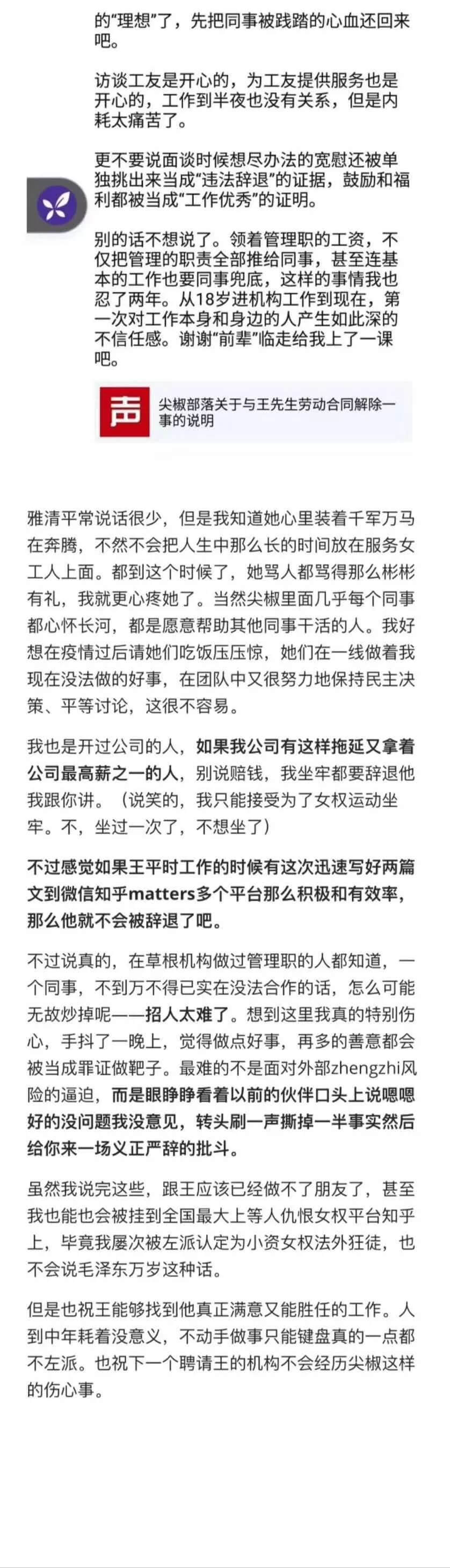 如果妳们不希望我留在尖椒部落是由于价值观,身份上的差异,大可以开诚布公地与我商谈,好聚好散,但是以见不得光的手段构陷我不能胜任工作,把我排挤出尖椒,这是我绝对不能接受的。妳们的做法,不仅践踏我作为劳动者的劳动付出,还跨越了「劳动法」规这一根本底线。