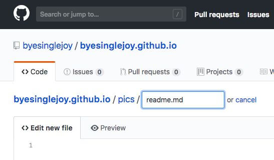 如果固定使用一个站点,通常会有很多图片。就像在本地电脑管理图片一样,为了便于管理,我们需要建立图片文件夹。在GitHub项目库的页面中点击"Create new file”,输入"文件夹名称/",出现上图页面时,输入"readme.md"(readme可以随便写)。