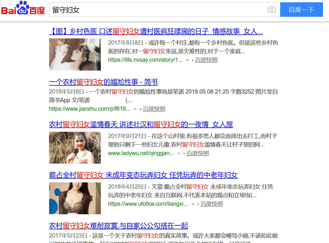 在百度键入「留守妇女」关键字,会发现「留守妇女」被塑造成供男人捕猎的「猎物」,成为人们猎奇的对象。「心里空荡荡的」、「感觉没人说话挺孤单」,这是很多「留守妇女」的内心独白。「留守妇女」一人就负担了负担家庭的重任,但她们的真实境遇很少有人关心。
