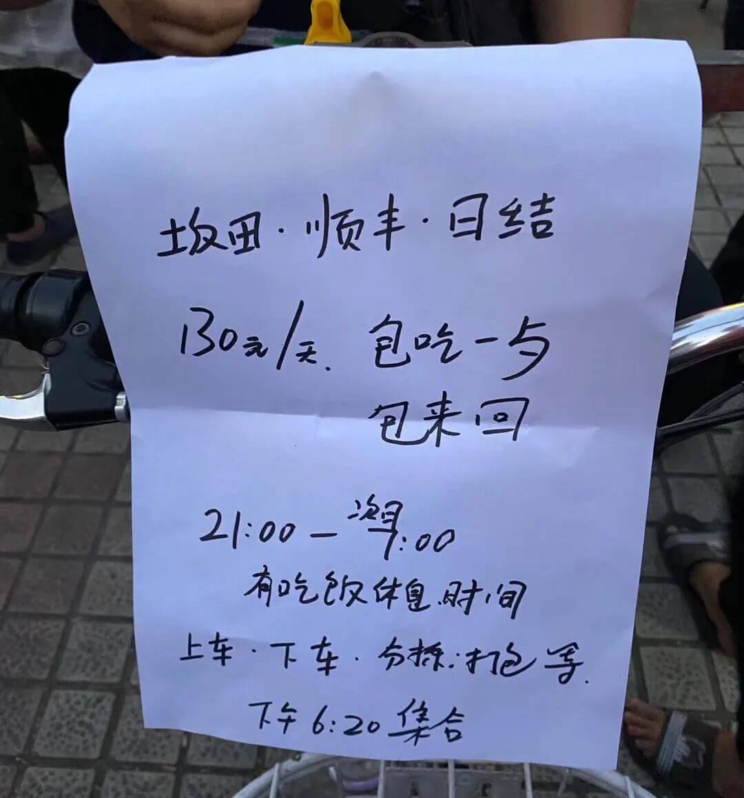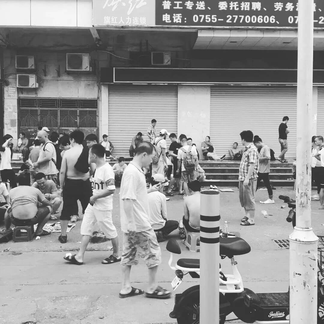 打工的人多,自然找工的人就多。景乐新市场的一众人力市场,像黑洞一般吸引四面八方的人们,他们被吸引然后被标价,接着被一车一车地卖到各间工厂,有的就地卖到深圳的厂,有的被卖到东莞,甚至被卖到外省。