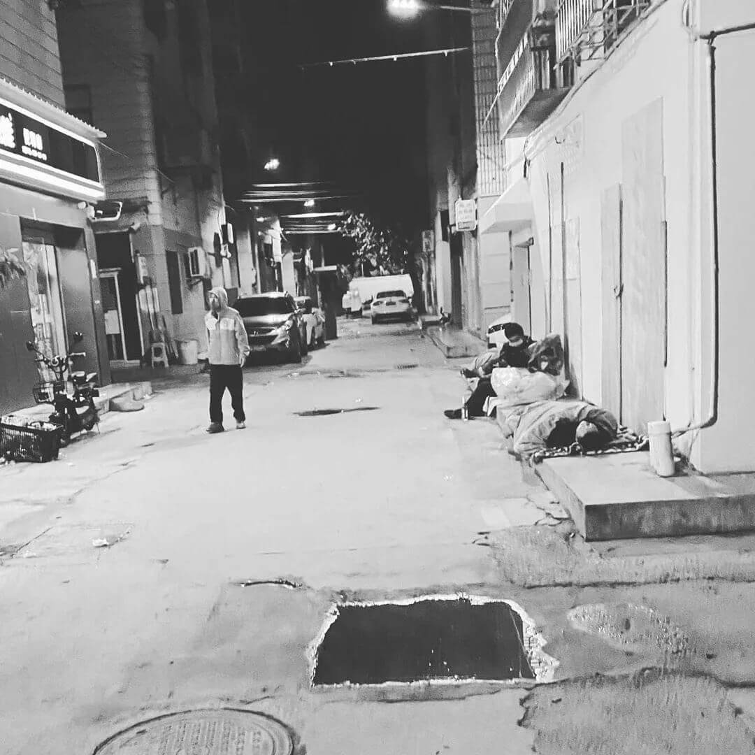 等到年初五、六的时候,三和附近的城中村被封锁,进出必须先要用体温枪枪毙才可以,而租户必须持通行证才能出入,睡床位的只许出不许进。有一些老哥滞留在城中村里面,夜间直接露天睡在三和泊寓楼下。那栋泊寓年前装修好,一直没有住人。那晚,那栋泊寓大门紧闭,灯火通明,空无一人,楼下的三和大神裹紧了棉被。