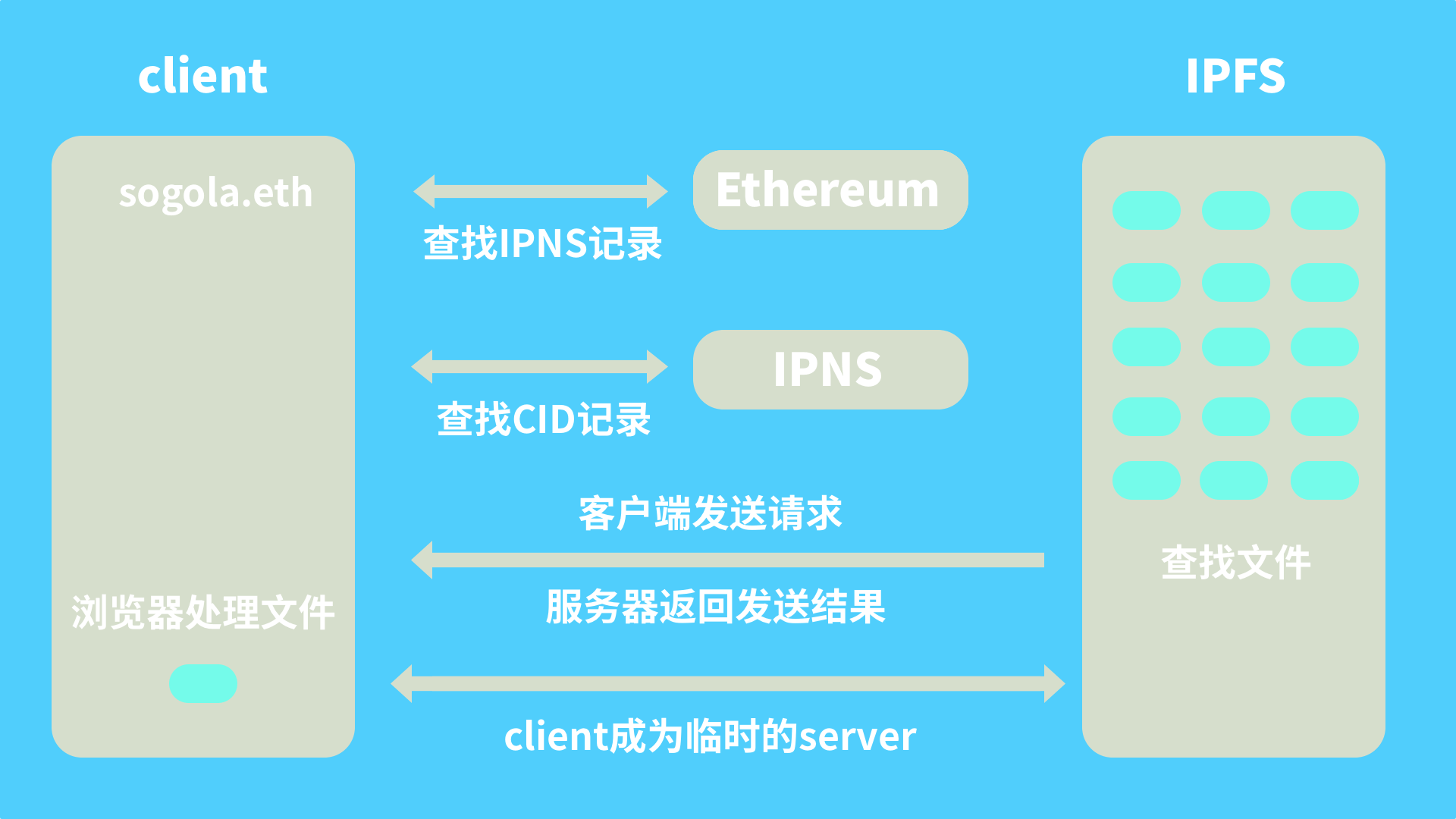 我们可以简单地认为IPNS代替了传统域名和DNS服务器,IPFS代替了服务器。