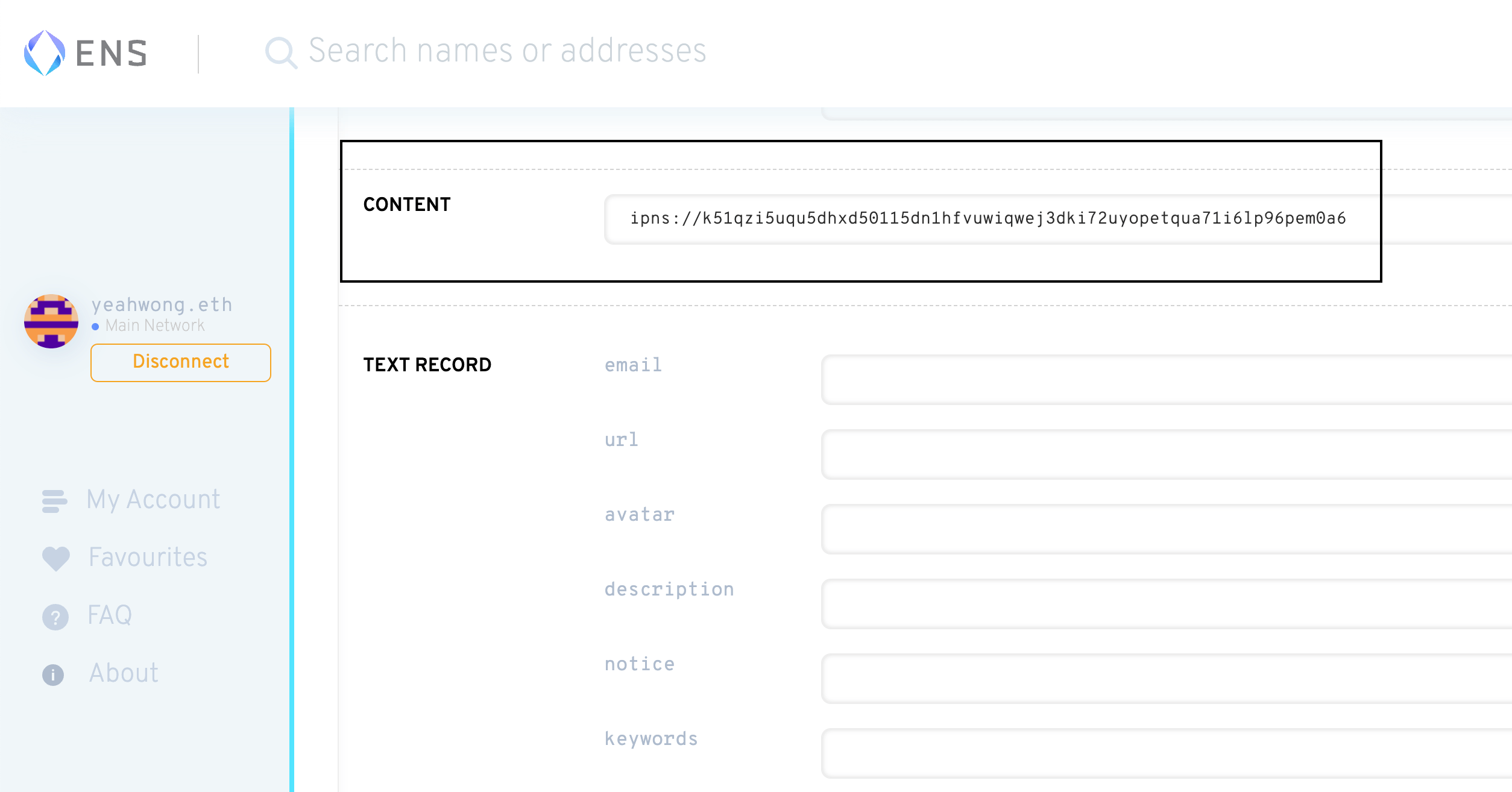 使用ENS绑定IPNS,就是利用Ethereum账本作为DNS账本。在ENS合约之中,将IPNS地址记录到Content Hash,这样任何人都可以访问Ethereum账本,查询相应的ENS绑定的IPNS。