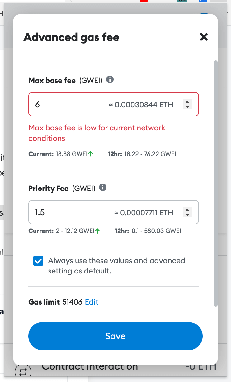 这里有一个小tip,如果妳并不着急解析立刻失效,可自定义Max base fee和Priority fee。在metamask中打开gas fee的高级管理选项,在确认操作的时候,编辑gas fee选项即可。